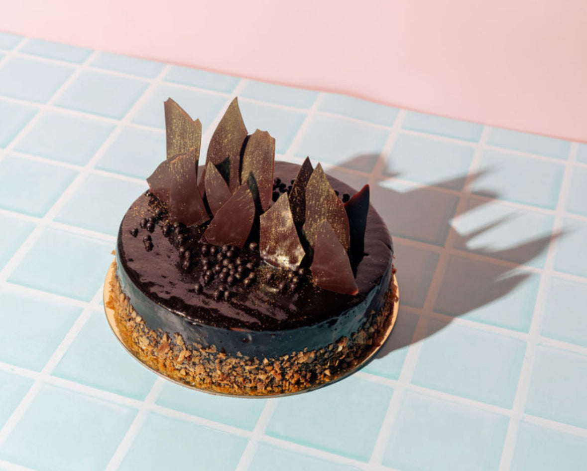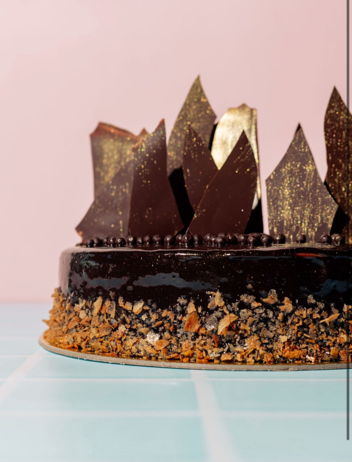 CHOCOLATE HAZELNUT MOUSSE, ALMOND SPONGE, CHOCOLATE GLAZE & CRISP CHOCOLATE PEARLS